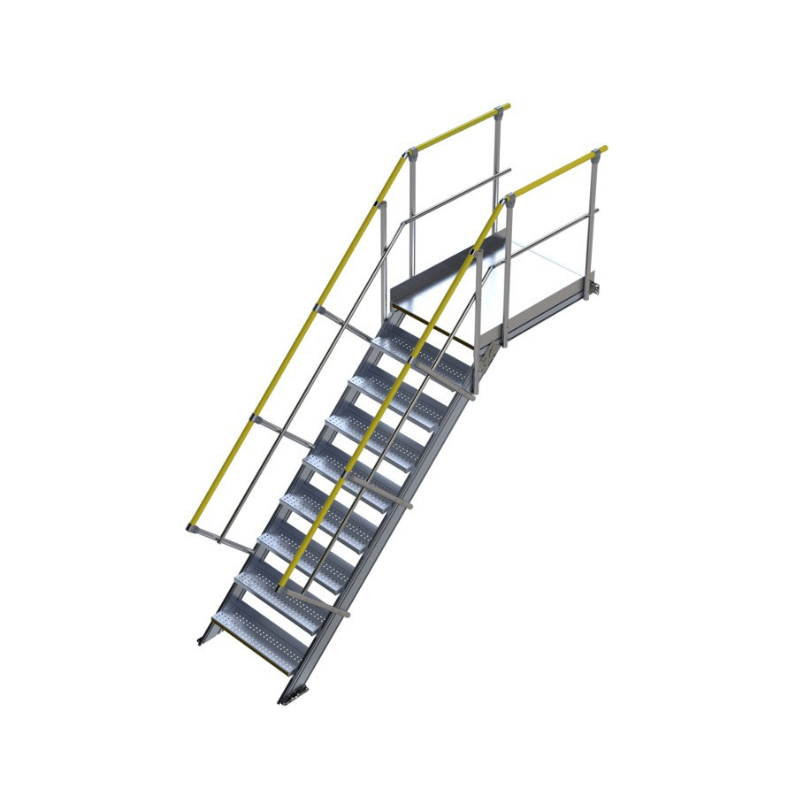 L'escalier Industriel avec plateforme à 45° et une largeur de passage de 600 mm est la solution idéale pour les accès en hauteur sécurisés en milieu industriel, pour les accès toitures sécurisé et les accès machine. Fabriqué en aluminium, nos escaliers industriels sont résistants à la corrosion. Cet escalier avec plateforme offre une fiabilité d'utilisation pour vos opérateurs et techniciens. Nos escaliers standardisés sont conçus pour vous offrir les tarifs les plus compétitifs pour tous vos besoins d'accès. Nous recommandons l'utilisation des escaliers industriels avec une inclinaison à 45° pour les usages fréquents. Muni de garde-corps à droite et à gauche, choisissez parmi de plus 16 hauteurs d'escaliers disponibles de 400 mm à 3200 mm.