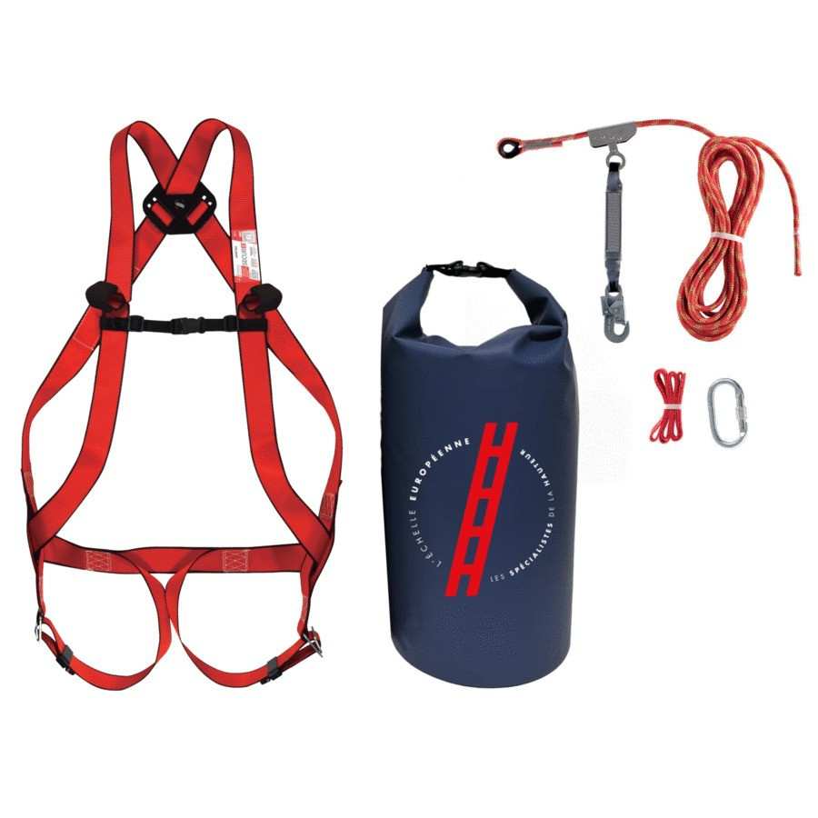 - Harnais SECUREE à 2 points d'ancrage. Coulisseau sur corde diamètre 12 mm de 10m avec "prolongateur absorbeur"et mousqueton à double linguet en acier ouverture 22mm